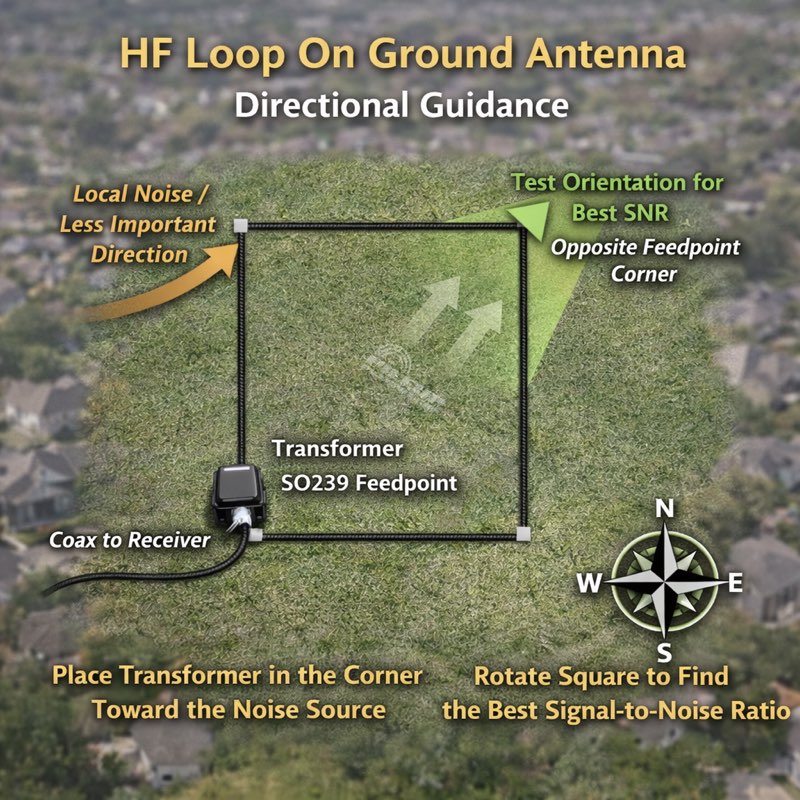 For best results, deploy the loop directly on the ground in as square a shape as your space allows. A square Loop On Ground fed at one corner can show a broad directional preference at low angles, but the exact pattern depends on loop symmetry, ground conditions, nearby structures, and frequency. In practice, the best approach is to rotate the square and compare signal-to-noise ratio on your target signals. Keep the loop symmetrical, avoid routing the feedline alongside the loop, and keep the feedline away from household noise sources where possible.