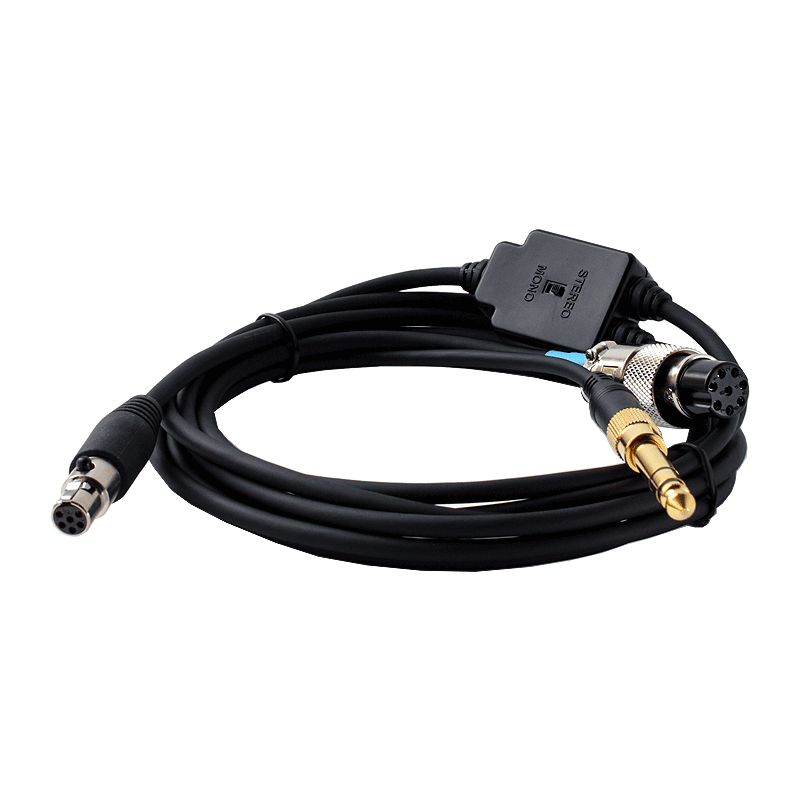 Headset-to-radio cable connecting a radiosport RS60CF-10A headset to a FlexRadio 6400(M) or 6600(M) transceiver. With headset PTT output to RCA. Includes a 2 x female to 1 x male RCA “Y-cable” for using both the headset PTT and additional PTT switch.